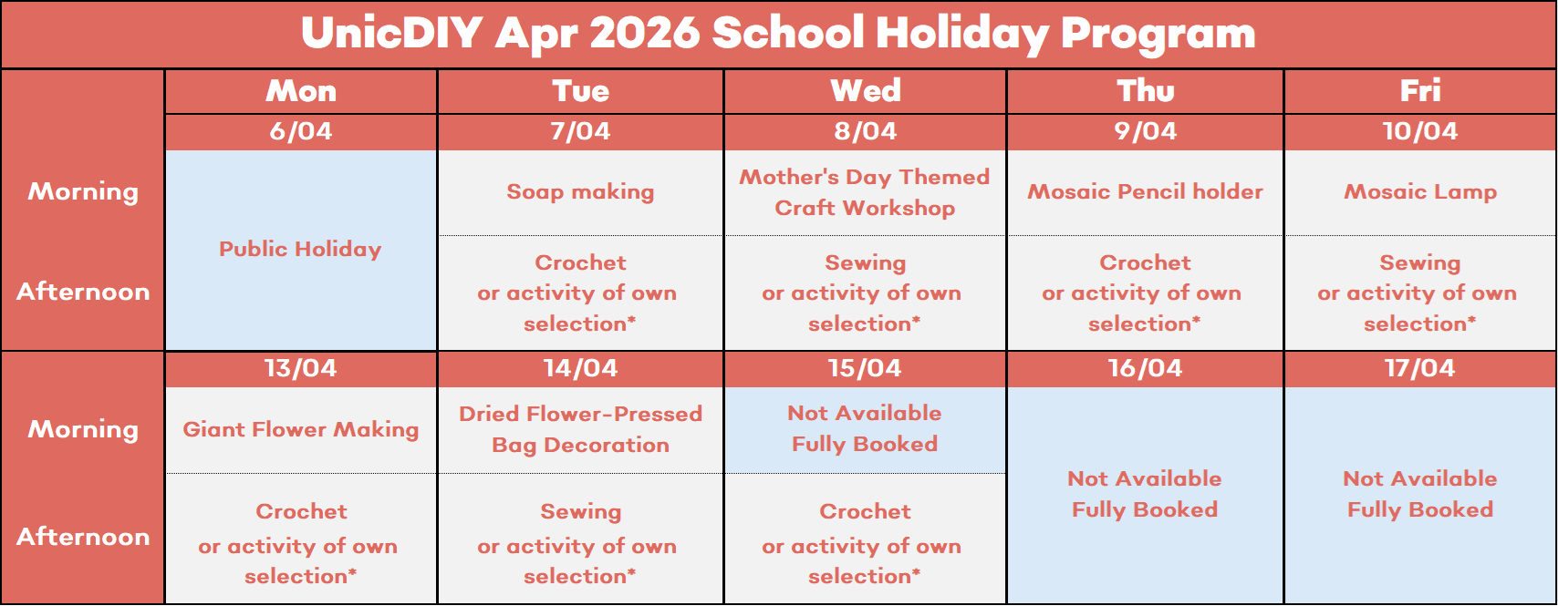 Daily from 9:00 AM to 5:00 PM. Suitable for children aged 5 and above. Free snacks are provided. Half day options is available, morning from 9am-1pm, afternoon from 1pm to 5pm. For afternoon sessions that include Sewing or Crochet, the structured class runs for 2 hours, followed by 2 hours of other guided craft activities.